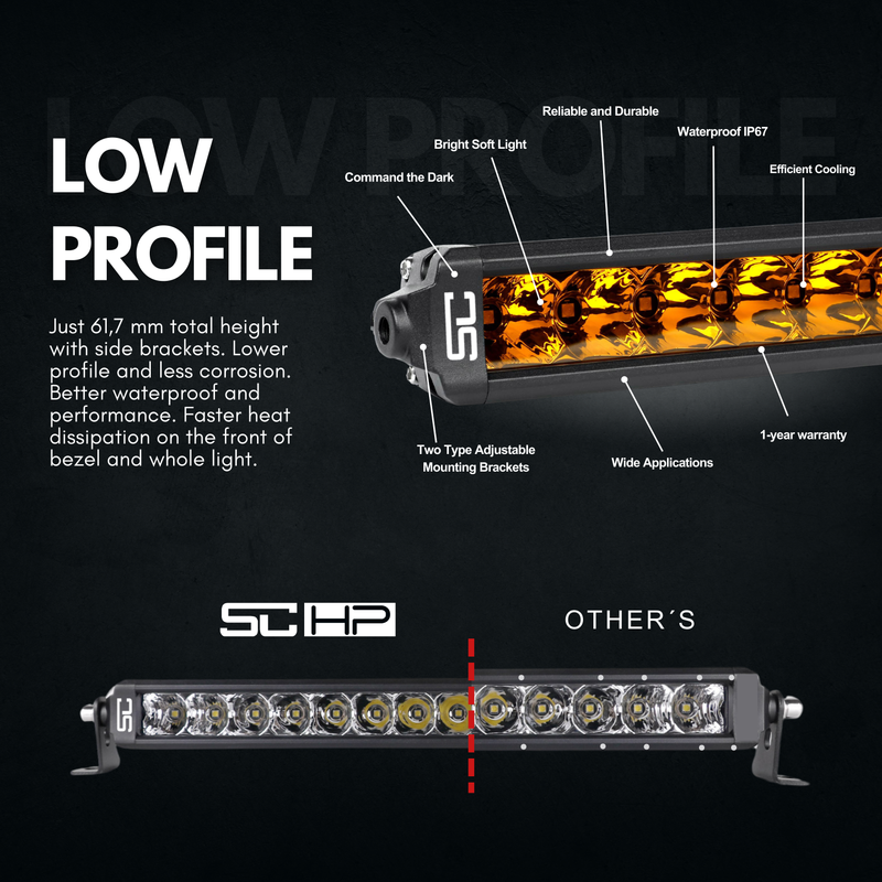 HP SERIES de SC off road tienen el rendimiento óptico más optimizado para lograr un mejor patrón de haz de luz con chips LED OSRAM P8 de alta eficiencia y una disipación de calor más rápida en la parte frontal del bisel y en toda la luz.